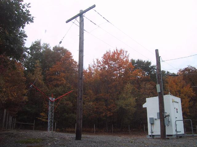 Charmingly named 'BARTY', 'AV' (probably short for 'Avoca', a nearby town) is an outer-marker for the Scranton / Wilkes-Barre airport. Tucked away off a windy, hilly road (west side of the road about a mile south on Westminster Rd. from Rt.315 near Laflin), it is unsurprising it doesn't get out particularly well; it's surrounded by tall trees in a tiny clearing, and the phone-pole supported 'T' antenna is quite low at 20' or so.