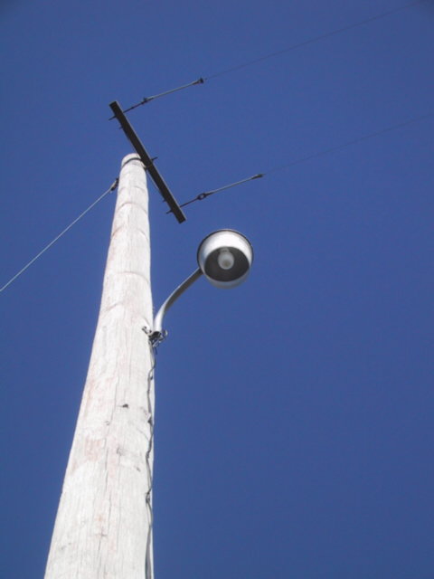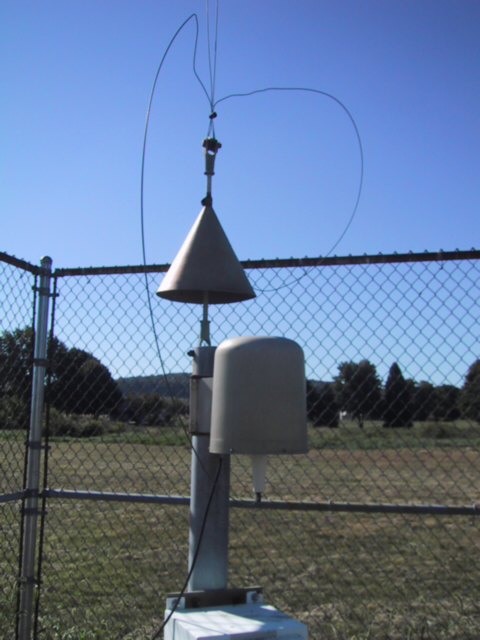 EUD is a great example of a reasonably well implemented yet minimalist NDB installation. It belongs to a small airfield off Route 30, a few miles to the west of York, PA, sitting just by the edge of the airfield near a small lane that runs alongside it. A phone-pole supported classic 'T' antenna, some 150 feet long and 30 feet high, and, here's the difference, the transmitter nailed on the side of a short pole poking out of the ground! At 25 Watts, it radiates quite well; there is probably a better-than-average (for NDBs) ground installation. The transmission itself is of the two-carrier variety - one carrier on continuously ('carrier') whilst the second, about a kilohertz higher in frequency, is keyed with the ID. The synthesizers are a touch ropey, there being noticable phase-noise, which manifests itself as a raspiness to each of the carriers individually, but not to the 'modulation' note which is of course the difference of the two.