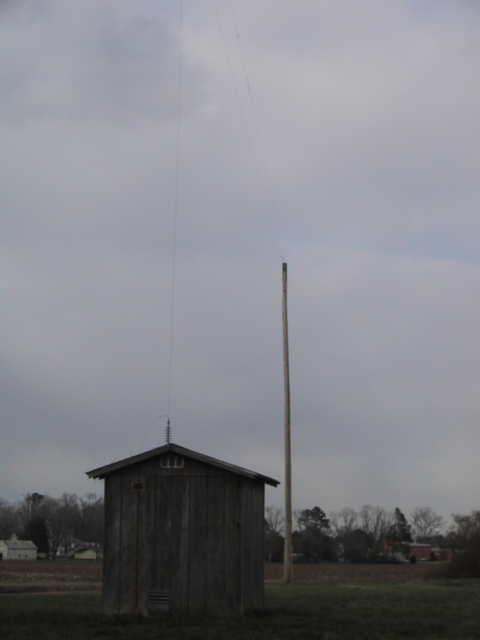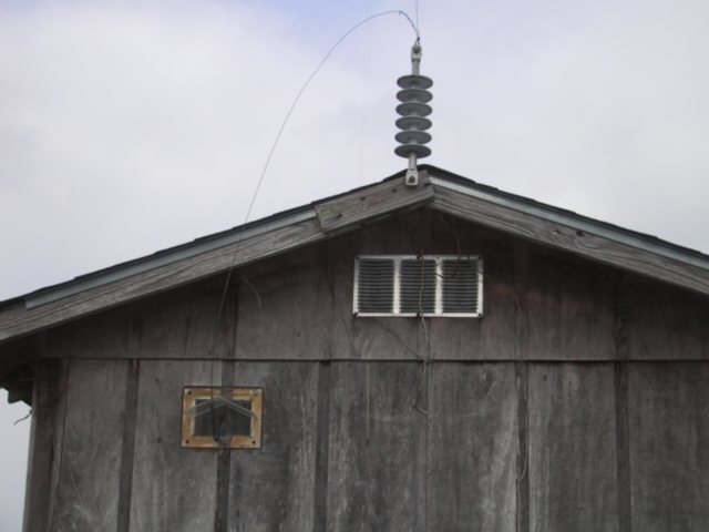 As classic a rural NDB as it gets. Two thirty-foot poles some 150 feet apart, centre-fed vertically from the transmitter hut directly underneath. At 25 Watts, with this antenna, and presumably with the space available a decent ground system, RNW gets out reasonably well; despite copious co-channel signals I can hear it quite often at home in Pennsylvania, some 400 miles distant. The 1020Hz keying is a bit wonky, but distinctive as a result.
