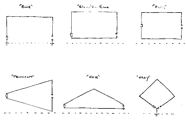 The many and various designs have next to nothing to choose between them for pattern (do I have to say 'cardioid' even once more?) but play variously to ease of installation, size, ready direction switching, and/or relatively constant impedance and/or accurate tracking of nulls over broad bandwidth. As for the last two, it is of little consequence what the antenna 'looks like' to the receiver, the 'broadband' designs hold their patterns little better than any of the other designs, and those with theoretically deeper or wider nulls tend to wash out in the real world, particularly if the terminations are not carefully trimmed. They all differ in (very) minor response detail, since none of them are infinitesimally small in wavelength. Again, although tidy minds might rebel at the seeming asymmetry of the 'Elevated Ewe', Fig.2 top centre, versus the 'Flag' (Fig.2, top right) there is in neither modelling nor measuring anything of difference worth mentioning. However, the 'Elevated Ewe' is considerably easier to erect and maintain.