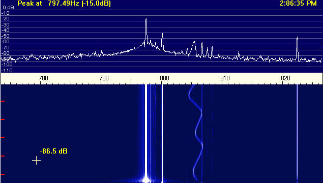An example of how one can get fooled by otherwise seemingly big, loud, fine, upstanding traces is highlighted by Fig.14 (right). Look closely at the waterfall for the 808.5 trace, and in the spectrographs above - the initial clue was that magically the signal seemed to have got louder on the'U' than on the omni, then quieter again on the 'U2'. Odd. The waterfall shows it winking in and out; an indication that there are two - possibly more - signals within the same measurement 'bin' beating with each other. One could either ignore this trace altogether (wise) or if one were truly desperate for data points, crank up the resolution of the FFT to prise the little buggers apart, and then measure them.