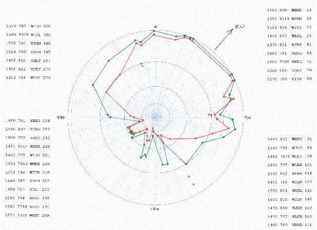 Now, transfer the cribs to the polar plot. At this point, it is likely one'll find mistakes in station identities - their results just don't 'look right' plotted, and are usually transpositions with another station. Verify the bearings, adopt the changes, update the cribs. With tongue poking out of the corner of one's mouth, and with your favourite colour crayons, join the dots like they taught in primary school. Plotting has to be done the hard way at first, by cross-referring bearings with the stations with the data, but at that point a bit of work in preparing the polar plot with stations with channels pre-marked at the appropriate bearings can save a lot of aggro for further analyses later on. Here's one I prepared earlier . . . (Fig.15)