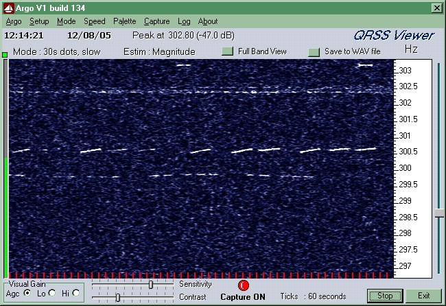 'TMO' ('300.5) soldiers on nicely, come hail, high water, snow, snow, or snow. Nice capture of 'MO' ('299.8), David in Missouri - a first here! His signal is discernable in and out through the late night, becoming quite bright towards dawn. Also in the picture is a hint of WD2XGI ('302.6), in Minnesota.